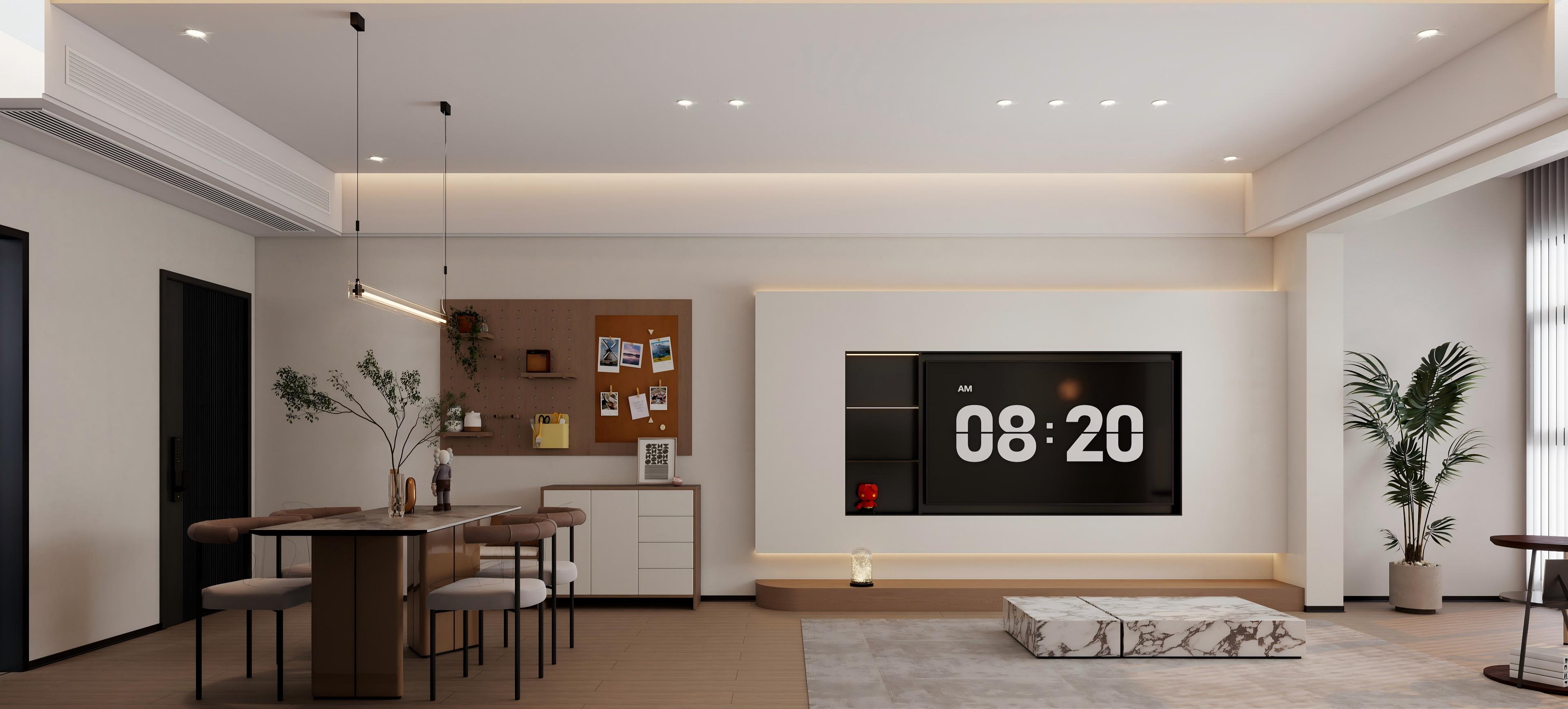 客餐廳:現(xiàn)代簡(jiǎn)約原木風(fēng),無主燈設(shè)計(jì) + 懸浮電視墻,洞洞墻增加生活感,原木餐桌椅搭配大理石臺(tái)面,溫馨通透,兼具休閑與用餐功能。