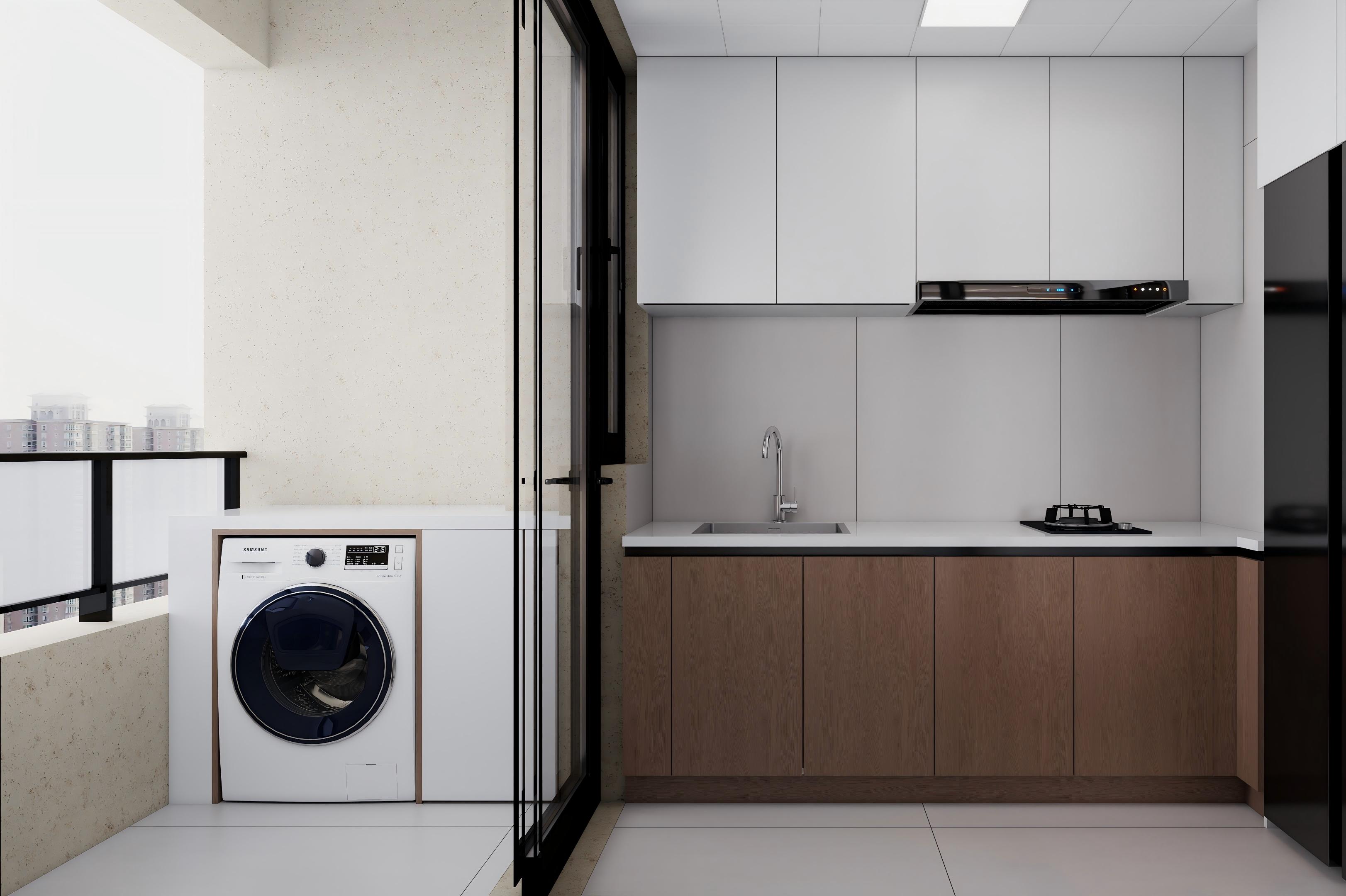 廚房 + 家政陽臺(tái):現(xiàn)代簡(jiǎn)約原木風(fēng),奶白吊柜搭配深棕地柜,黑白五金點(diǎn)綴,陽臺(tái)嵌入洗衣機(jī),玻璃門分隔空間,干凈通透,實(shí)用又顯質(zhì)感。