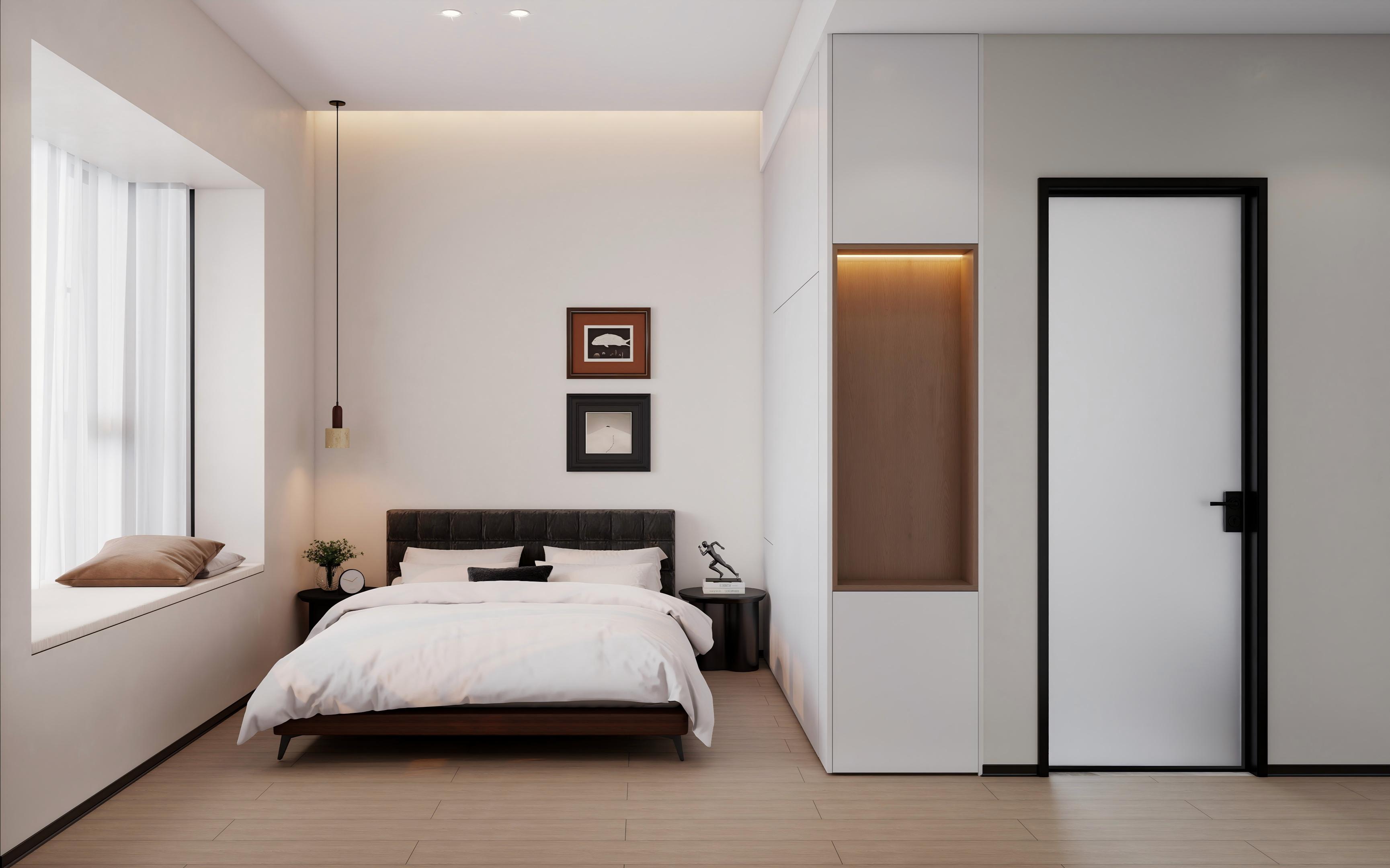 主臥:現(xiàn)代簡(jiǎn)約原木風(fēng),奶白墻面搭配深木色床架,懸浮衣柜 + 氛圍燈,飄窗增加休閑感,色調(diào)柔和,打造靜謐舒適的睡眠空間。