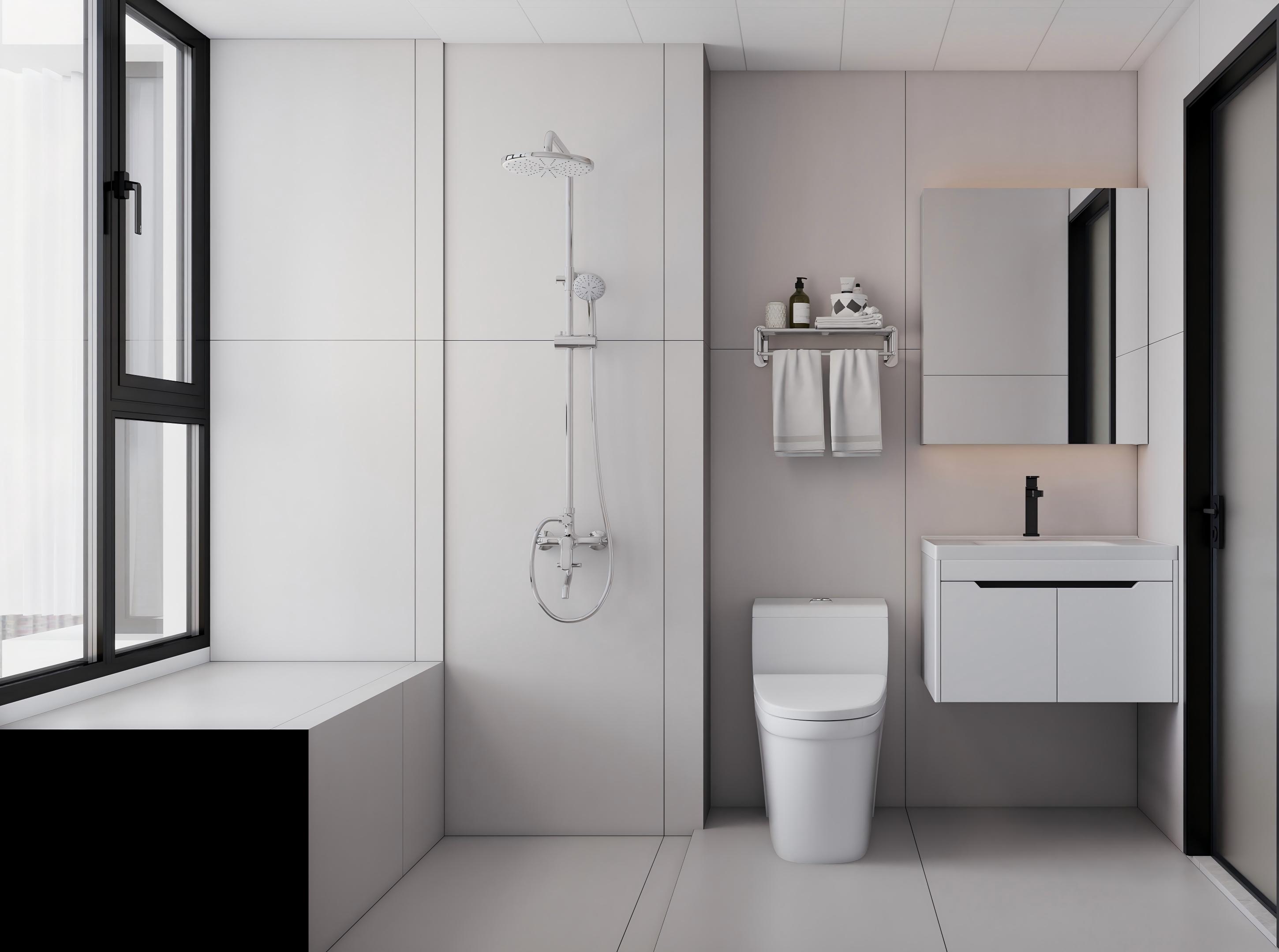 衛(wèi)生間:現(xiàn)代極簡(jiǎn)奶油風(fēng),通鋪奶白大瓷磚,懸浮洗手臺(tái) + 智能鏡柜,干濕分離布局,銀色五金提升精致度,整潔明亮,好打理又顯高級(jí)。