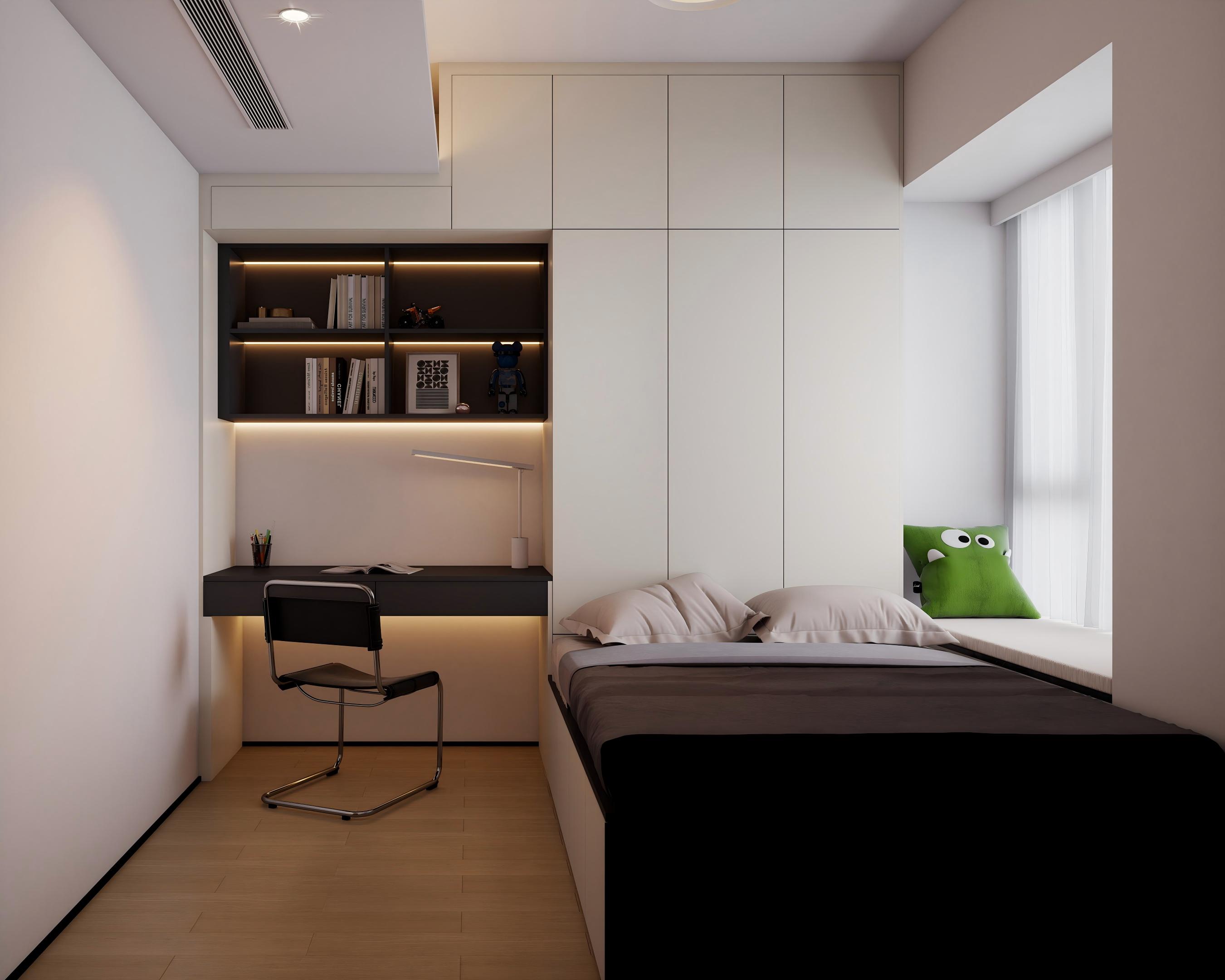次臥:延續(xù)極簡基調(diào),奶白通頂衣柜 + 懸浮書桌,嵌入式開放格 + 線性燈,黑白撞色家具,空間利用率拉滿,風(fēng)格簡約清爽,兼顧學(xué)習(xí)與休息,適配成長需求。