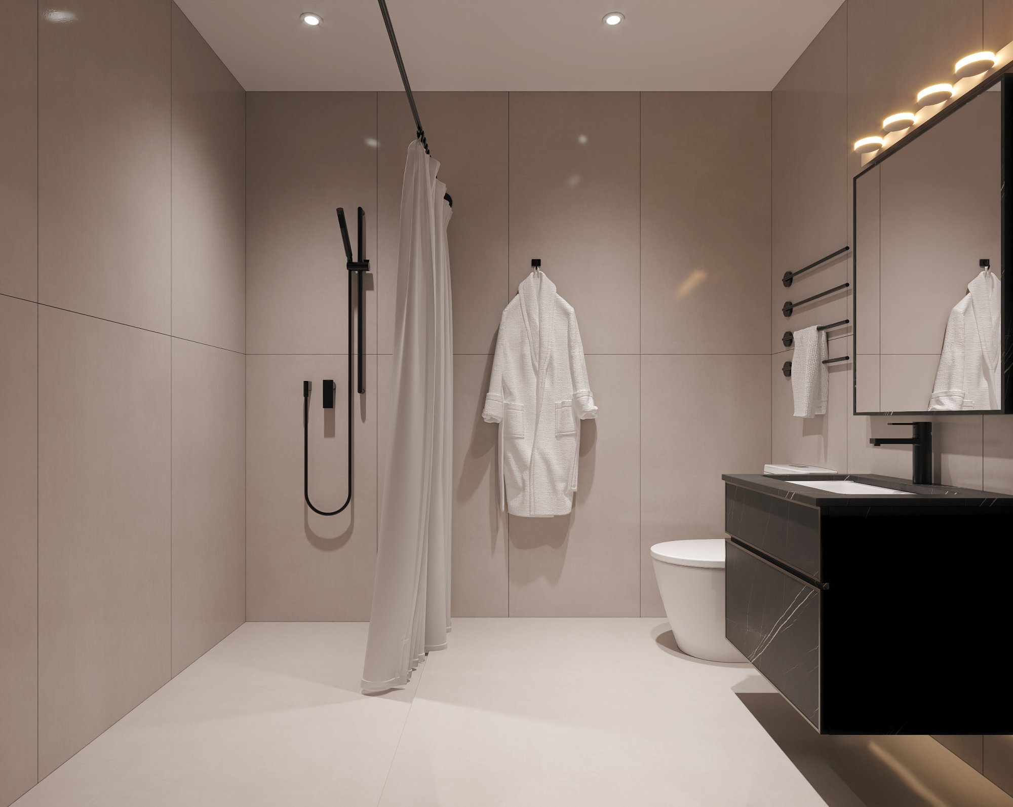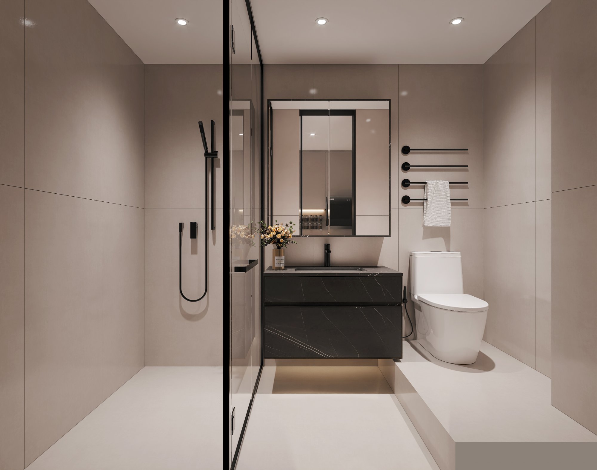 衛(wèi)生間:采用經(jīng)典的黑白灰搭配,淺米色大磚通鋪,黑色懸浮浴室柜和五金件提亮,干濕分區(qū)設(shè)計(jì),清爽耐臟又好打理。