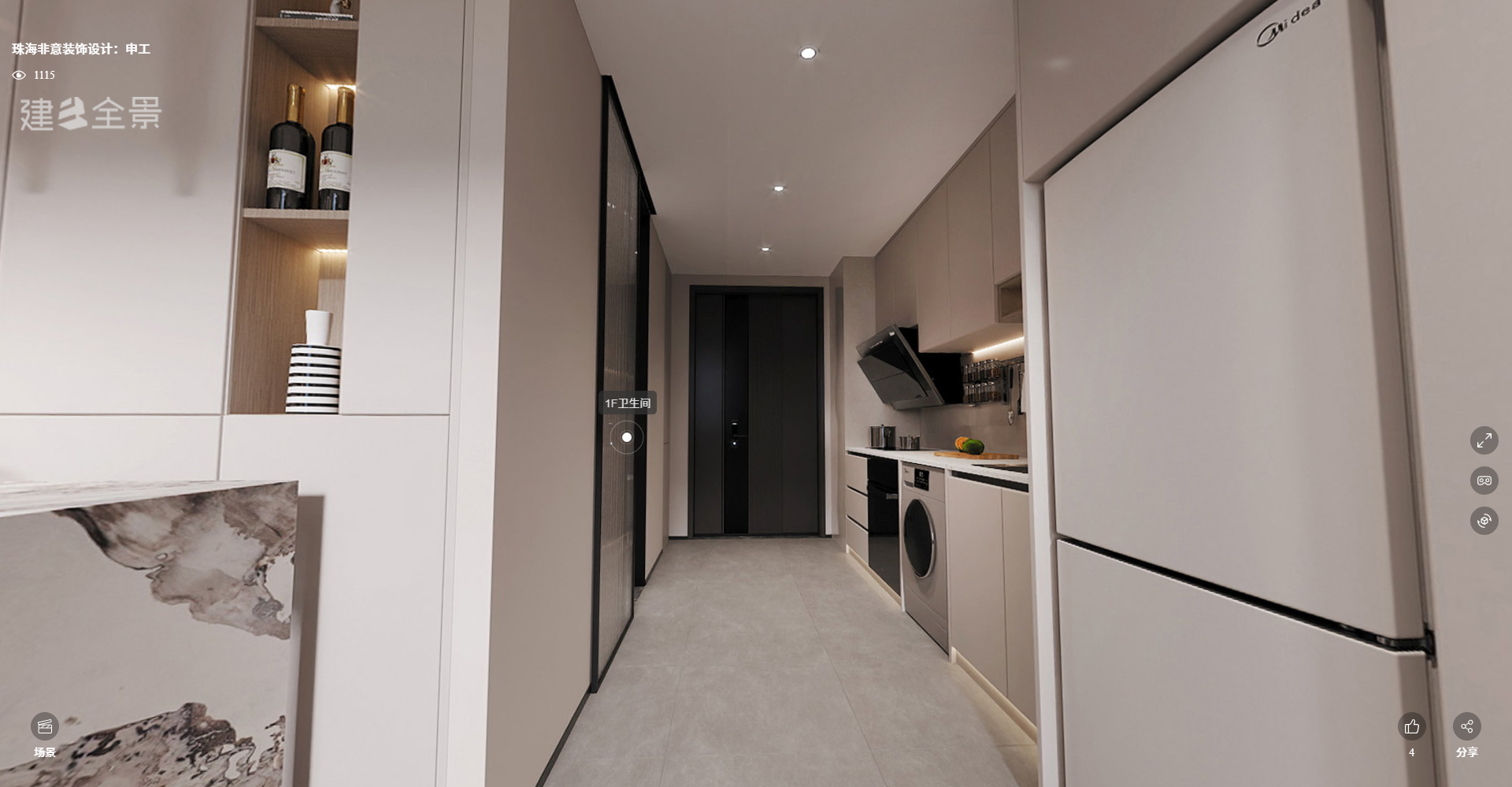 廚房 / 玄關(guān):走實(shí)用極簡(jiǎn)路線,淺色系整體櫥柜嵌入了冰箱、洗衣機(jī)等家電,動(dòng)線清晰,干凈利落,沒有多余裝飾。