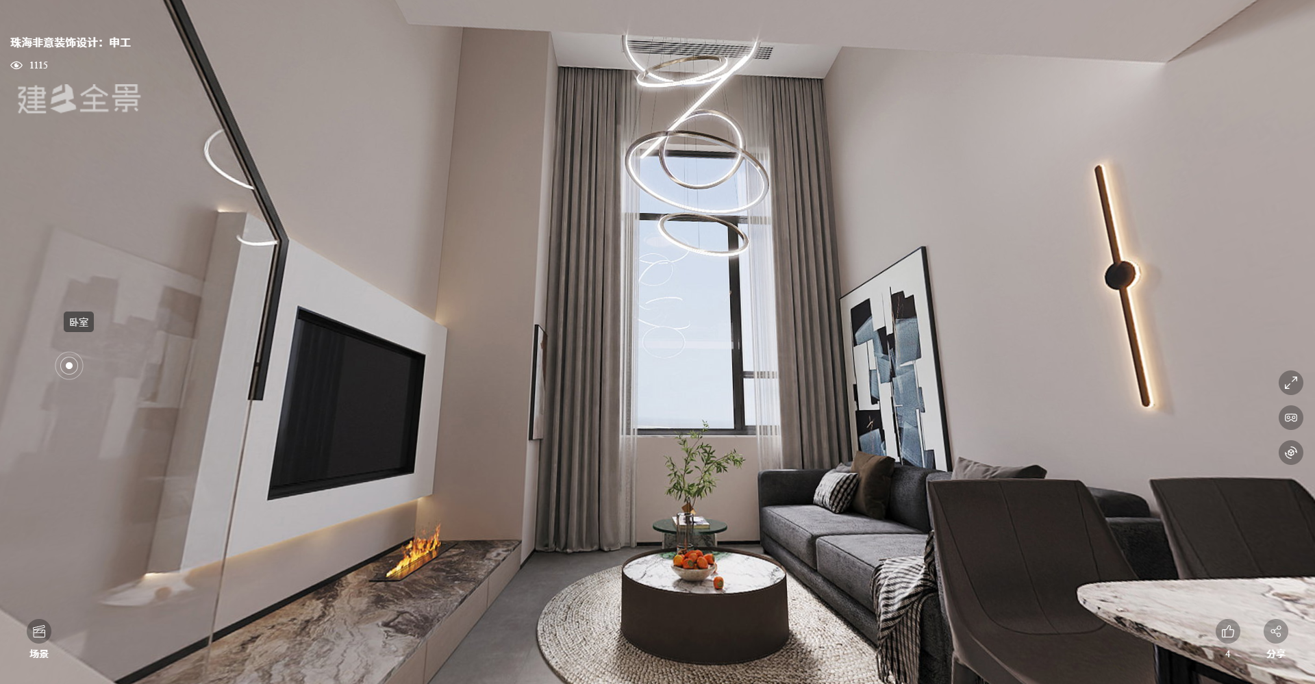 客廳:挑高優(yōu)勢(shì)被充分利用,用奶油白 + 暖灰的低飽和色調(diào)打底,搭配多層環(huán)形吊燈和無主燈燈帶,氛圍柔和又高級(jí)。大理石電視墻和仿真壁爐是點(diǎn)睛之筆,簡(jiǎn)約里帶著輕奢感。