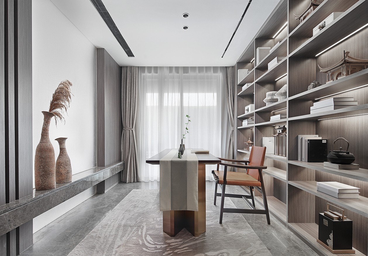 書(shū)房空間設(shè)計(jì)了一面開(kāi)放式展示柜,簡(jiǎn)潔流暢的線條設(shè)計(jì),搭配沉穩(wěn)的色調(diào),整體風(fēng)格相得益彰,大氣而不失雅致。