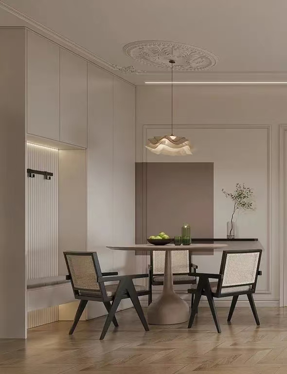 輕法式奶油風(fēng)的裝飾細(xì)節(jié)是體現(xiàn)其風(fēng)格的關(guān)鍵??梢赃x擇一些帶有雕花的裝飾品,如相框、鏡子、花瓶等,這些雕花元素能為空間增添一份精致感。