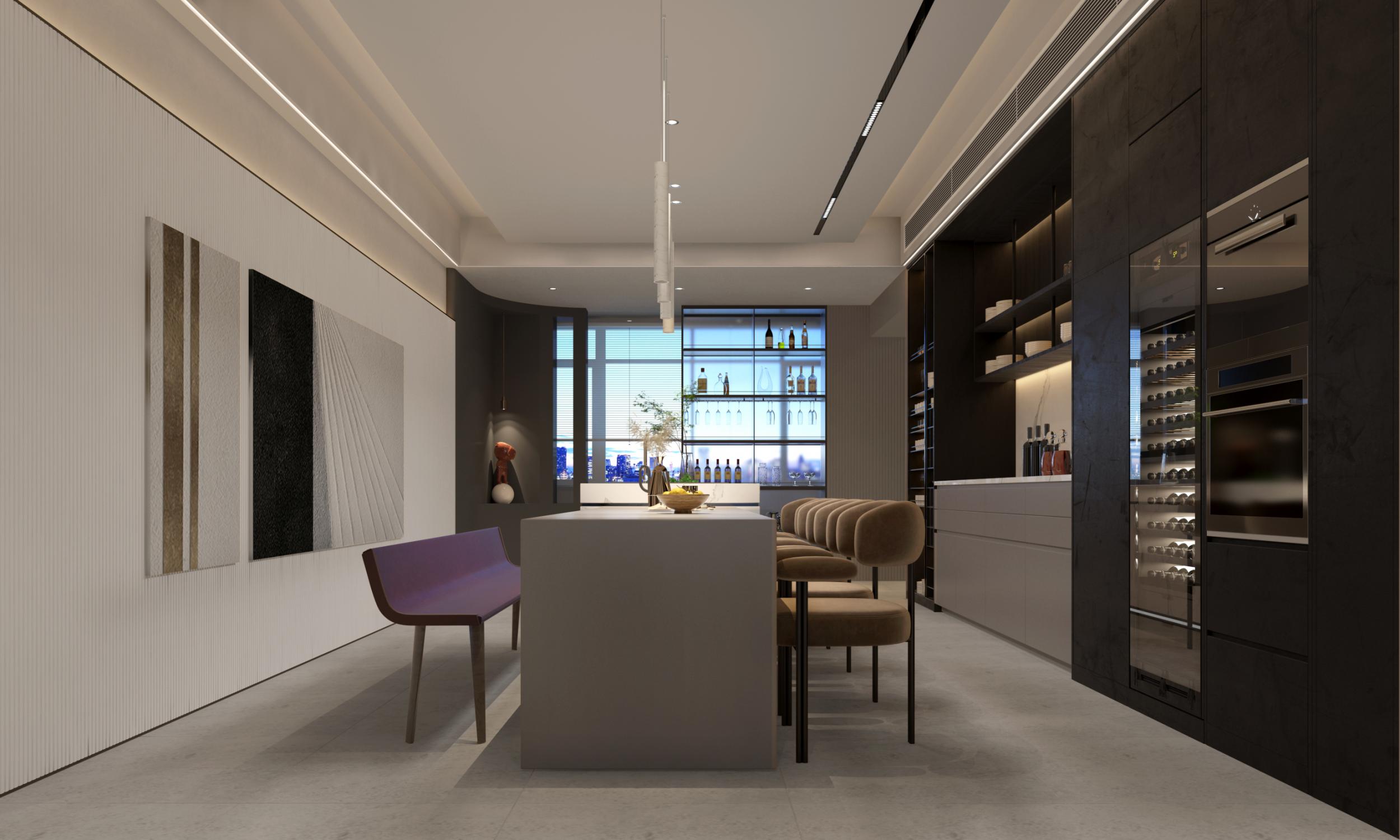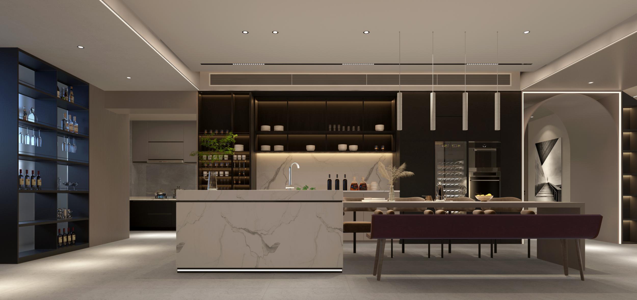 在大平層意式輕奢設(shè)計(jì)中,家具的選擇至關(guān)重要。意式家具以其優(yōu)雅的設(shè)計(jì)和精湛的工藝而聞名,是打造輕奢風(fēng)格的不二之選。在選擇家具時,我們可以優(yōu)先考慮線條流暢、造型簡約的款式,如皮質(zhì)沙發(fā)、木質(zhì)茶幾和金屬框架的餐椅等。這些家具不僅具有極高的實(shí)用性,還能在視覺上營造出一種優(yōu)雅而奢華的氛圍。