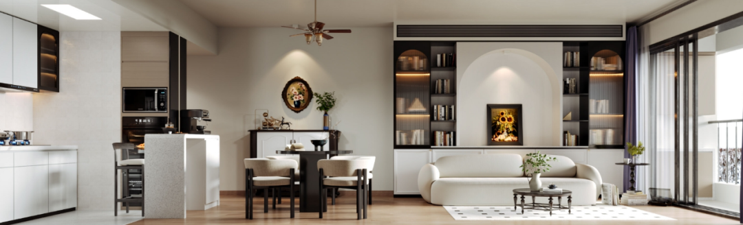 隱形門設(shè)計(jì):將臥室門、儲(chǔ)物間門與墻面做同色處理,門與墻面接縫處用隱形合頁(yè)和極窄門框,從視覺(jué)上弱化門的存在感,讓墻面保持整體感,間接提升空間整潔度。