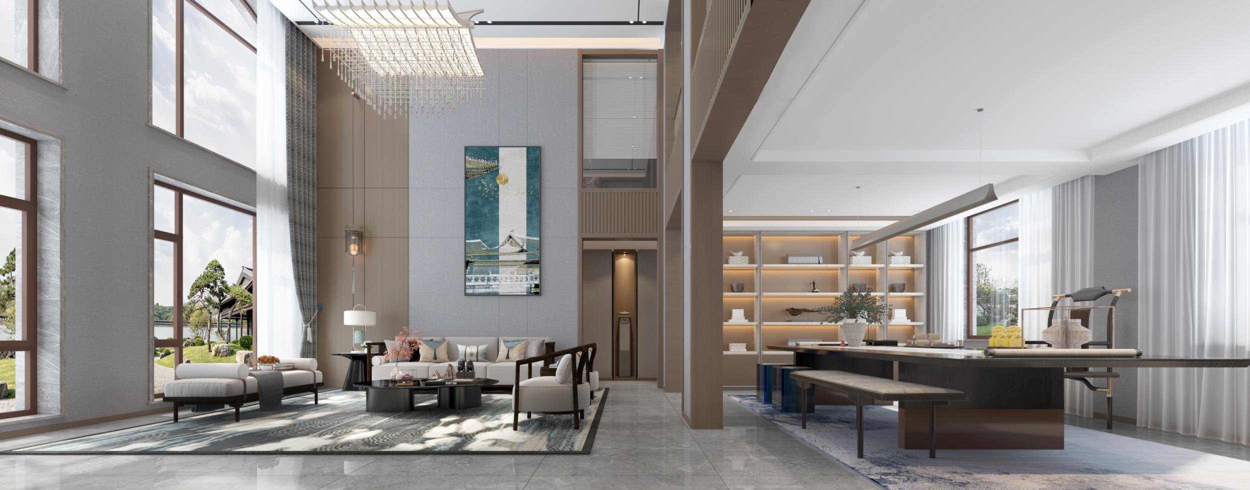 步入別墅內(nèi)部,客廳以挑高的空間設計展現(xiàn)出開闊與通透之感。巨大的落地窗將自然光線毫無保留地引入室內(nèi),與室內(nèi)的燈光交相輝映,營造出溫馨而明亮的氛圍。天花板上懸掛的吊燈,造型猶如傳統(tǒng)的中式燈籠,卻又以現(xiàn)代的材質(zhì)和工藝呈現(xiàn),燈光透過精致的燈罩灑下,如夢如幻。墻面裝飾著一幅大型的中式壁畫,以山水、樓閣為主題,墨色與色彩的交織,仿佛將一幅流動的古典畫卷定格在墻上,為空間增添了濃郁的文化氣息。家具的選擇上,實木的沙發(fā)、茶幾,線條簡潔卻質(zhì)感十足,搭配上柔軟的坐墊和靠枕,既保留了中式家具的端莊穩(wěn)重,又兼顧了現(xiàn)代生活的舒適體驗。