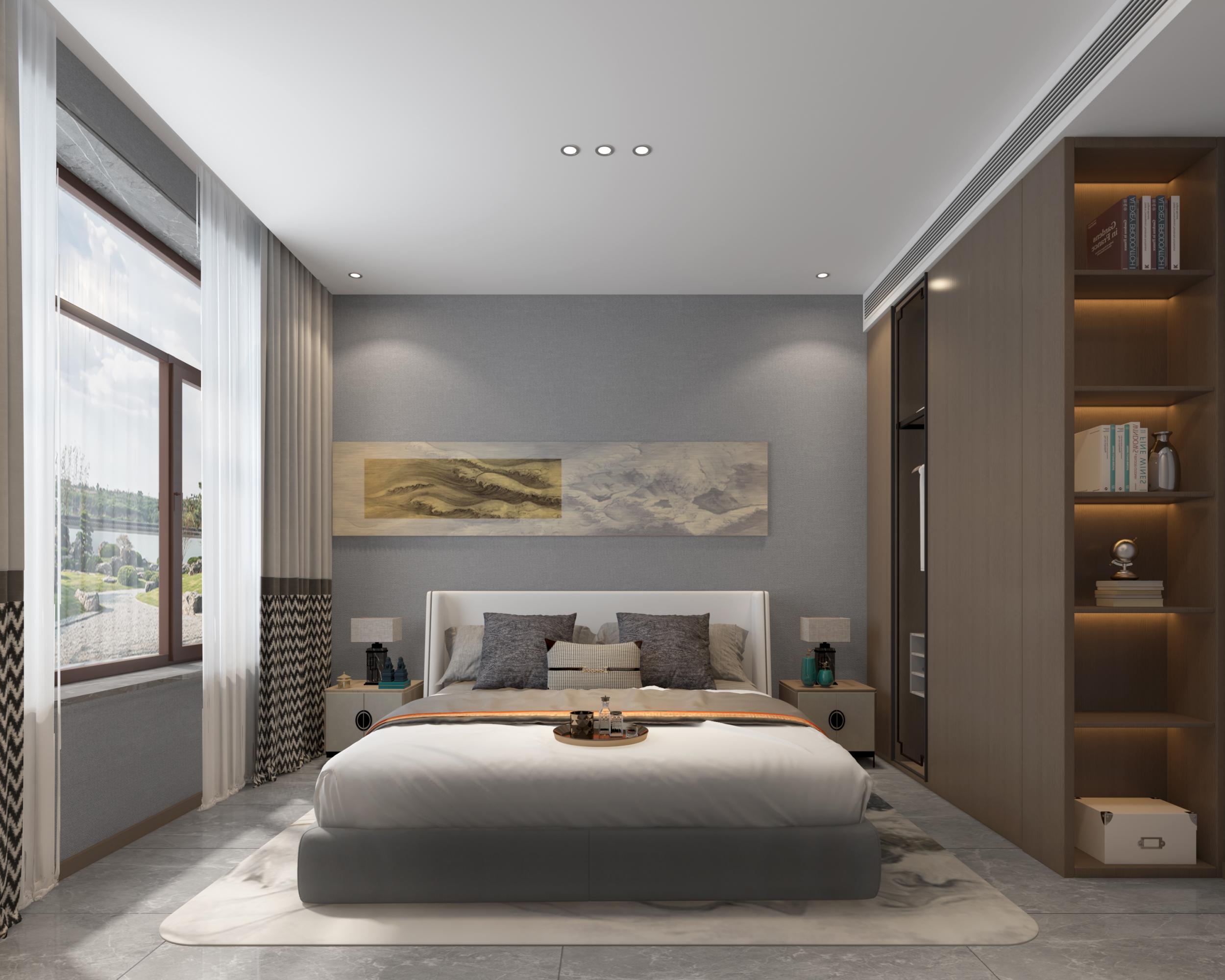 臥室是休憩的私密空間,新中式別墅的臥室設計在追求舒適的同時,也不忘融入中式元素。床具選用實木框架,搭配柔軟的床墊和高品質(zhì)的床品,營造出溫馨舒適的睡眠環(huán)境。床頭背景墻以中式風格的壁紙裝飾,圖案或許是淡雅的山水,或許是古樸的花紋,為空間增添了一份寧靜與雅致。窗戶旁設置了一個小型的書桌和椅子,供主人閱讀、品茶或欣賞窗外的景色。書桌上擺放著一盞中式臺燈和一些文房四寶,體現(xiàn)出主人對傳統(tǒng)文化的熱愛。衣柜則采用了現(xiàn)代與中式相結(jié)合的設計,簡潔的外觀下隱藏著強大的收納功能,滿足了現(xiàn)代生活的實際需求。