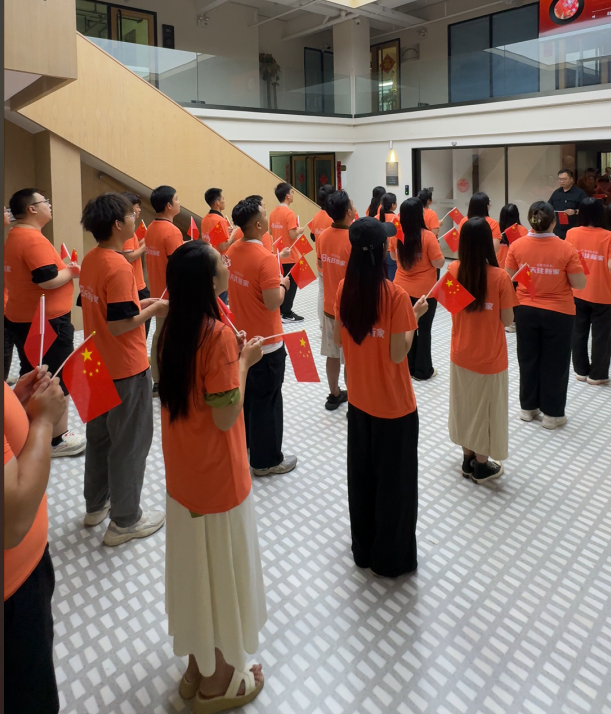 十一當(dāng)日,非意裝飾全體員工身著統(tǒng)一的橙色工作服,每個(gè)人手中都揮舞著鮮艷的五星紅旗映照出大家心中的愛國(guó)情懷,隨著激昂的旋律響起,《歌唱祖國(guó)》的熟悉音符在空氣中回蕩。全體員工齊聲高歌,歌聲嘹亮而整齊,將中華兒女對(duì)祖國(guó)的深情與贊美傳遞,大家用歌聲表達(dá)著對(duì)祖國(guó)繁榮昌盛的自豪,對(duì)民族復(fù)興的堅(jiān)定信念,在這一刻,每個(gè)人的心都與祖國(guó)緊緊相連,共同跳動(dòng)。